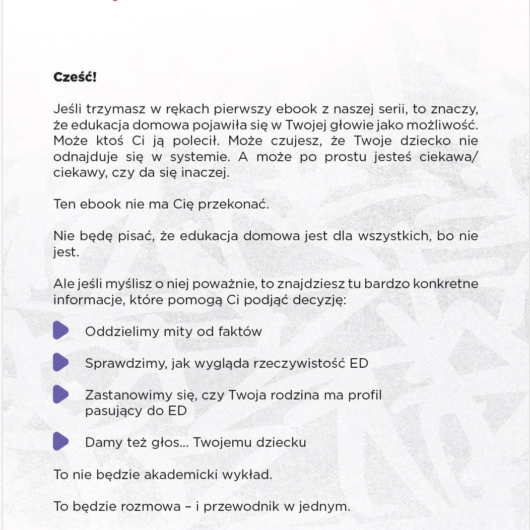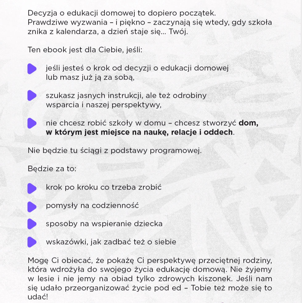 Ten ebook to punkt wyjścia. Bez ocen, bez lukru – za to z quizem, checklistą do sprawdzenia Waszej gotowości i z pomocą w odpowiedzi na najważniejsze pytanie: czy edukacja domowa pasuje do Waszej rodziny?
