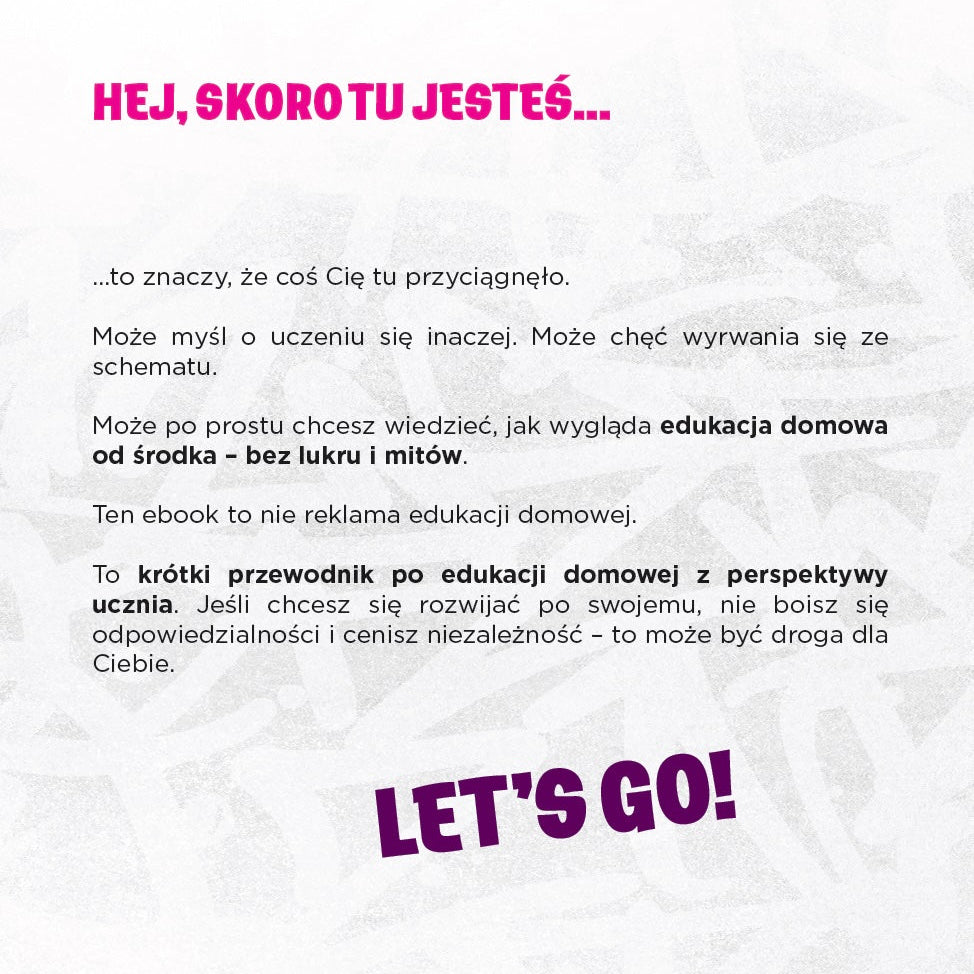 Napisany specjalnie dla nastolatków przewodnik, który pokazuje jak uczyć się inaczej – ale konkretnie. Jak ogarniać życie bez dzwonków, ławek i kartkówek. Jak zachować motywację, gdy się nie chce. I jak się nie bać, że zostaniesz sam(a).